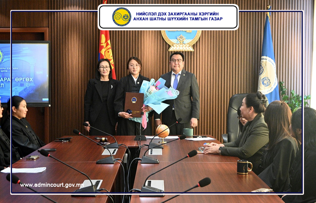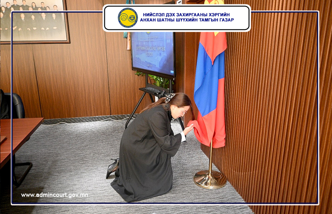 Шүүгчийн тангараг өргөх ёслолын ажиллагааг тус шүүхийн Тамгын газрын дарга Н.Батхүү удирдаж, Монгол Улсын Ерөнхийлөгчийн зарлигийг уншиж сонордуулан, шүүгч тангараг өргөснөөр Монгол Улсын шүүхийн тухай хуулийн 38 дугаар зүйлийн 38.1-т зааснаар шүүгчийн бүрэн эрх нь эхэлж байна.