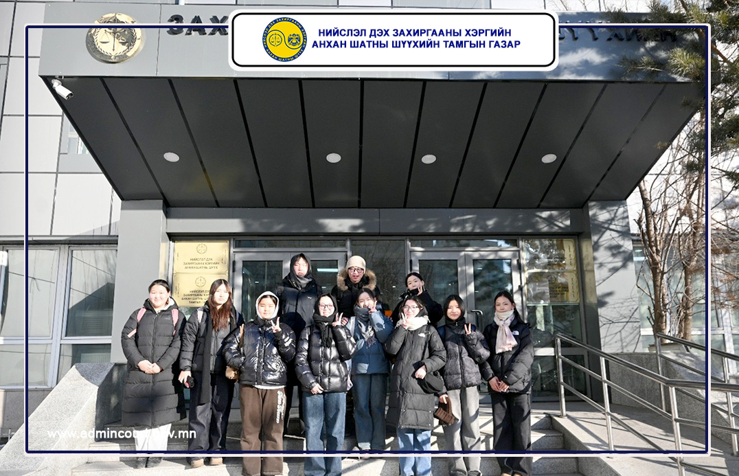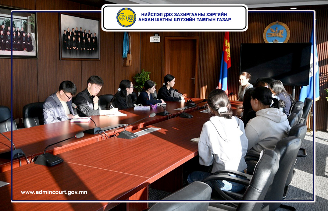Сурагчдад олон нийттэй харилцах мэргэжилтэн Б.Төгсбуянжаргал тус шүүхийн үүсэл хөгжил, бүтэц, орон тоо, шүүхээс иргэдэд үзүүлдэг үйлчилгээнүүдийн талаар мэдээлэл өгөн шүүх хуралдааны танхим болон шүүхийн байрыг танилцуулав.