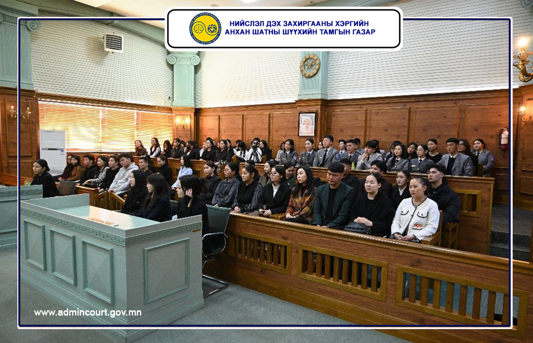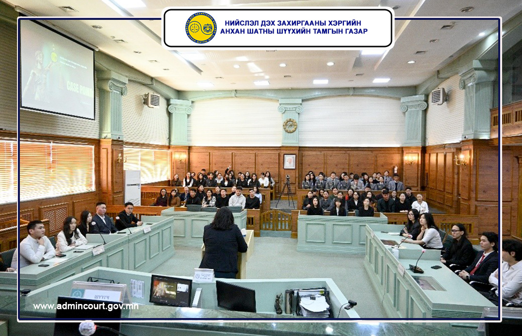Нийслэл дэх Захиргааны хэргийн анхан шатны шүүхийн Тамгын газраас санаачлан хууль зүйн их, дээд сургуулийн оюутнуудад тус шүүхийн шүүгч нар өөрсдийн шийдвэрлэж, хуулийн хүчин төгөлдөр болсон сонирхолтой кэйсүүдийг тайлбарлаж, ярилцах “Захиргааны хэргийн шүүх-Кейс судлал” хөтөлбөрийн хүрээнд 2026.03.13-ны өдөр ээлжит уулзалт, ярилцлага зохион байгуулагдлаа.