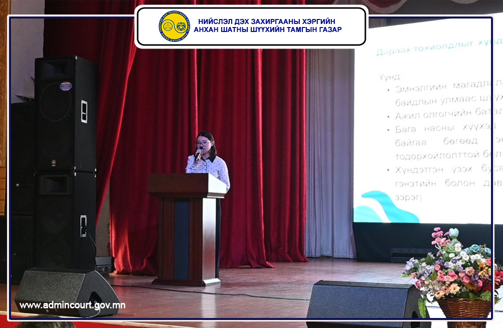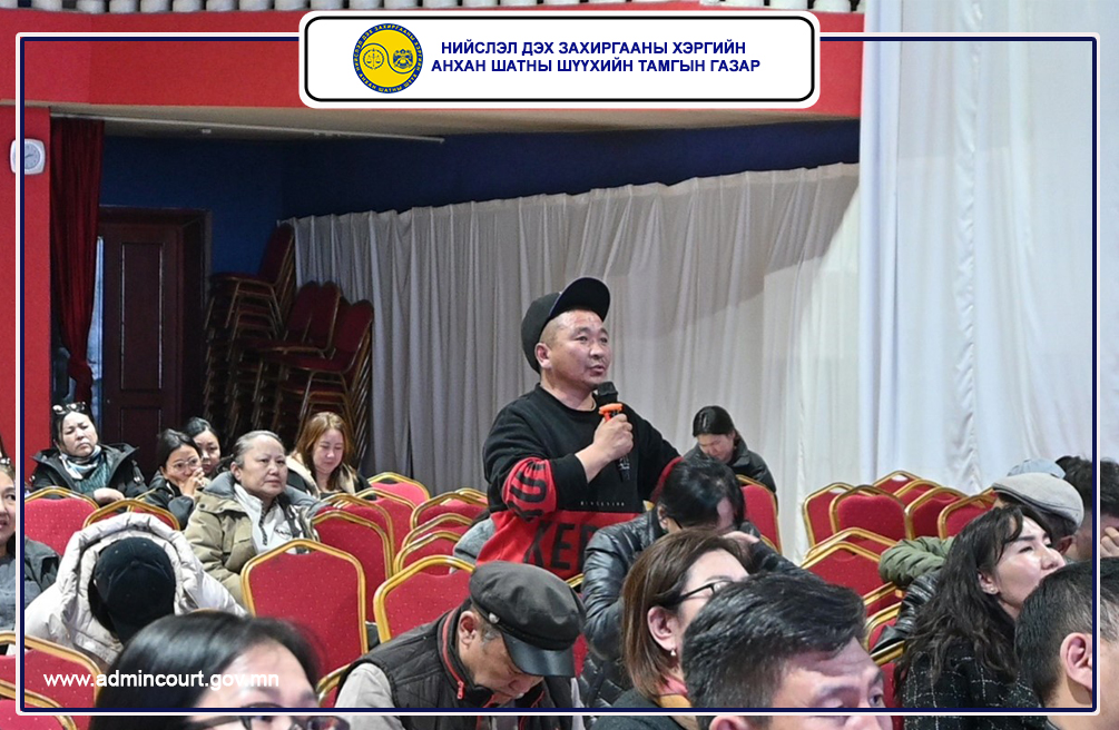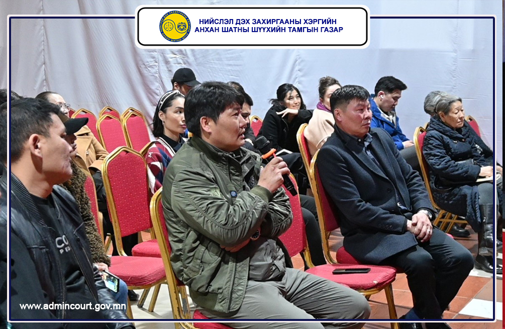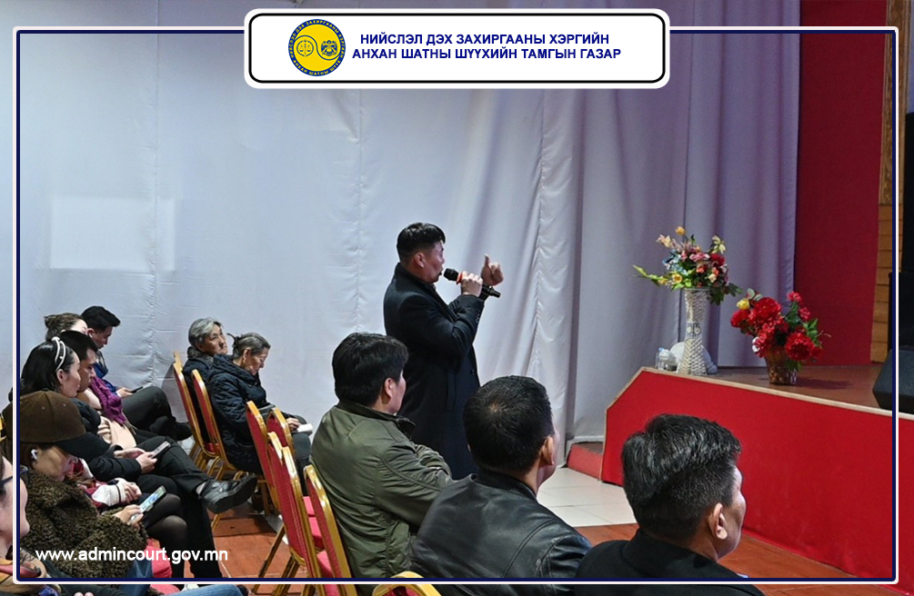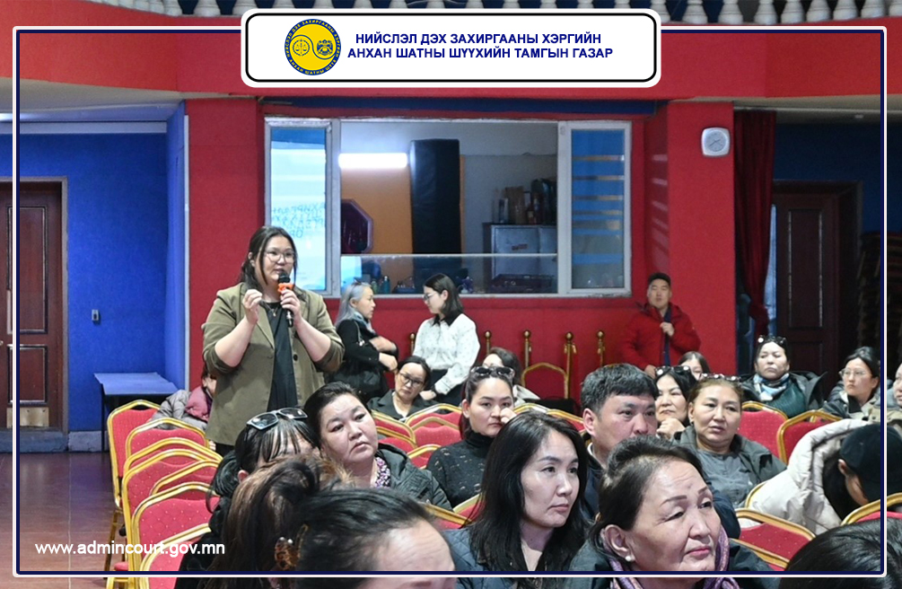 Нийслэл дэх Захиргааны хэргийн анхан шатны шүүхийн Тамгын газар, Хан-Уул дүүргийн Засаг даргын тамгын газартай хамтран Шүүхийн иргэдийн төлөөлөгч нарт зориулсан иргэдийн төлөөлөгчдийн эрх зүйн мэдлэгийг дээшлүүлэх, захиргааны хэргийн шүүхийн үйл ажиллагааг танилцуулах сургалтыг 2026 оны 04 дүгээр сарын 08-ны өдөр зохион байгууллаа.