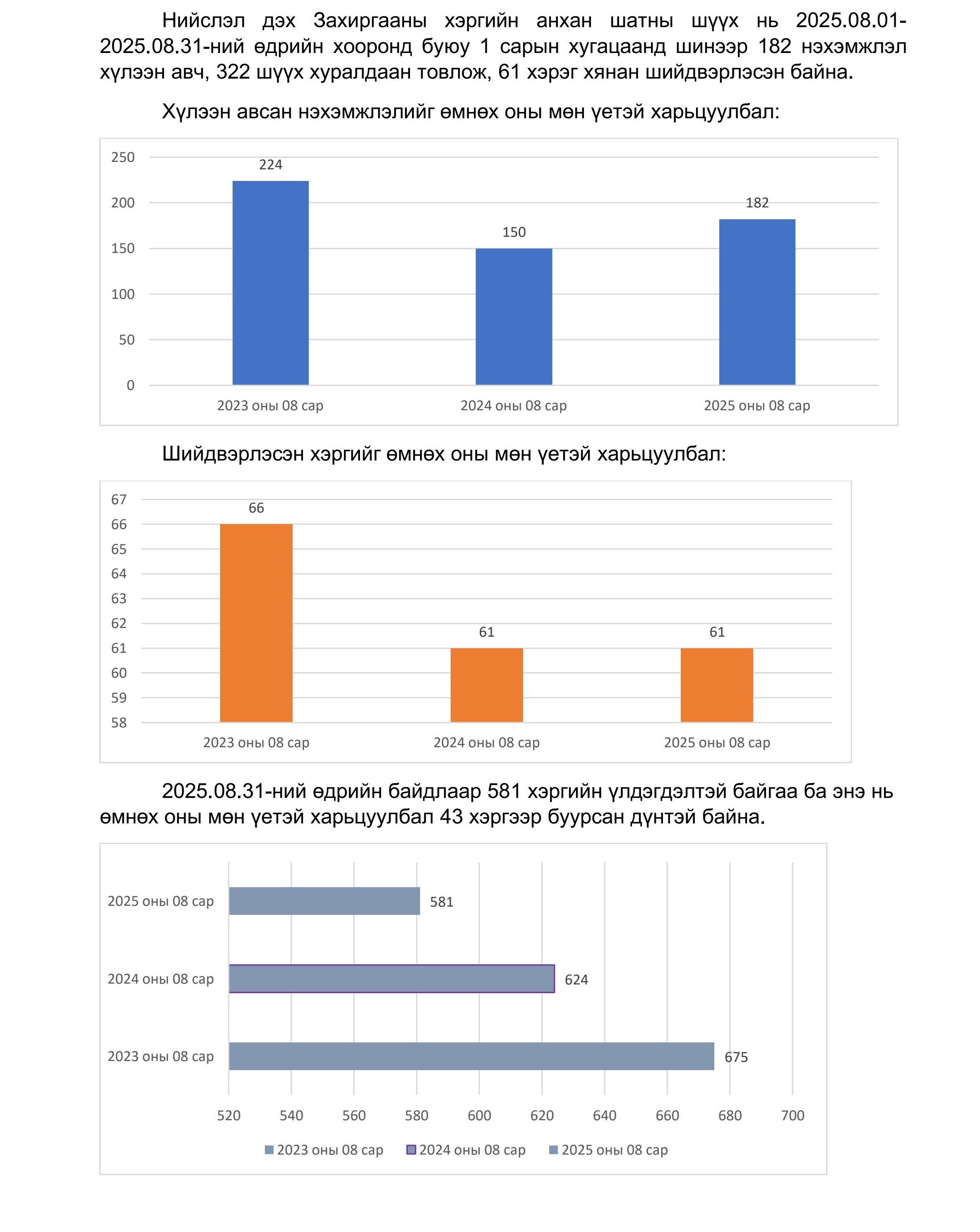 НИЙСЛЭЛ ДЭХ ЗАХИРГААНЫ ХЭРГИЙН АНХАН ШАТНЫ ШҮҮХИЙН 2025 ОНЫ 08 ДУГААР САРЫН ШҮҮН ТАСЛАХ АЖИЛЛАГААНЫ МЭДЭЭ