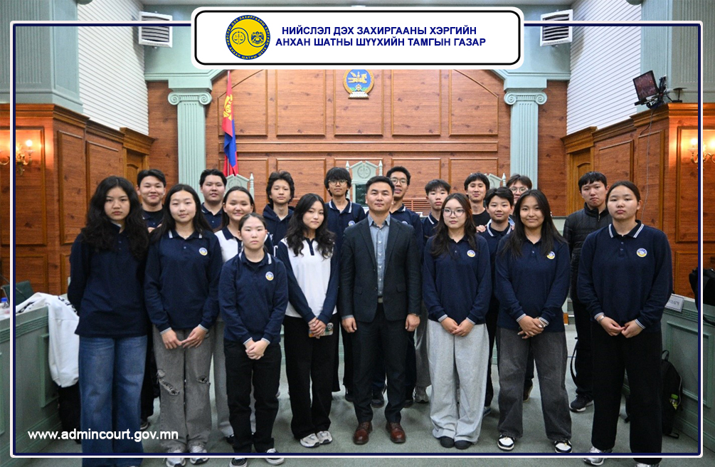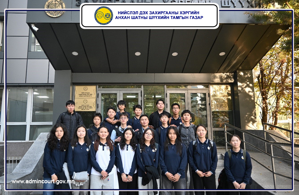 Нийслэл дэх Захиргааны хэргийн анхан шатны шүүхийн Тамгын газрын 2025 оны гүйцэтгэлийн төлөвлөгөөнд тусгагдсан олон нийтийг мэдээллээр хангах ажлын хүрээнд 2025 оны 10 дугаар сарын 01-ний өдөр Нийслэлийн ерөнхий боловсролын “Шинэ үе” сургууль -ийн 11 дүгээр ангийн сурагчид Нийслэл дэх Захиргааны хэргийн анхан шатны шүүхийн байр, шүүхийн өдөр тутмын үйл ажиллагаатай тус тус танилцлаа.